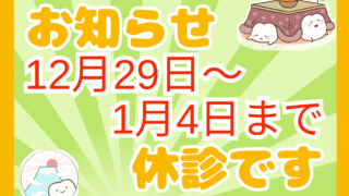 お知らせ 【お知らせ】12月28日~1月4日まで休診です。【令和7年度お正月休み】 平素より格別のご愛顧を賜り厚くお礼申し上げます。本年も残すところあとわずかとなりました。来年もスタッフ一同、皆様にご満足頂ける診療を心がける所存でございますのでより一層のご支援を賜りますよう、お願い申し上げます。なお、誠に勝手ながら、年末年... 2025.12.22 お知らせ